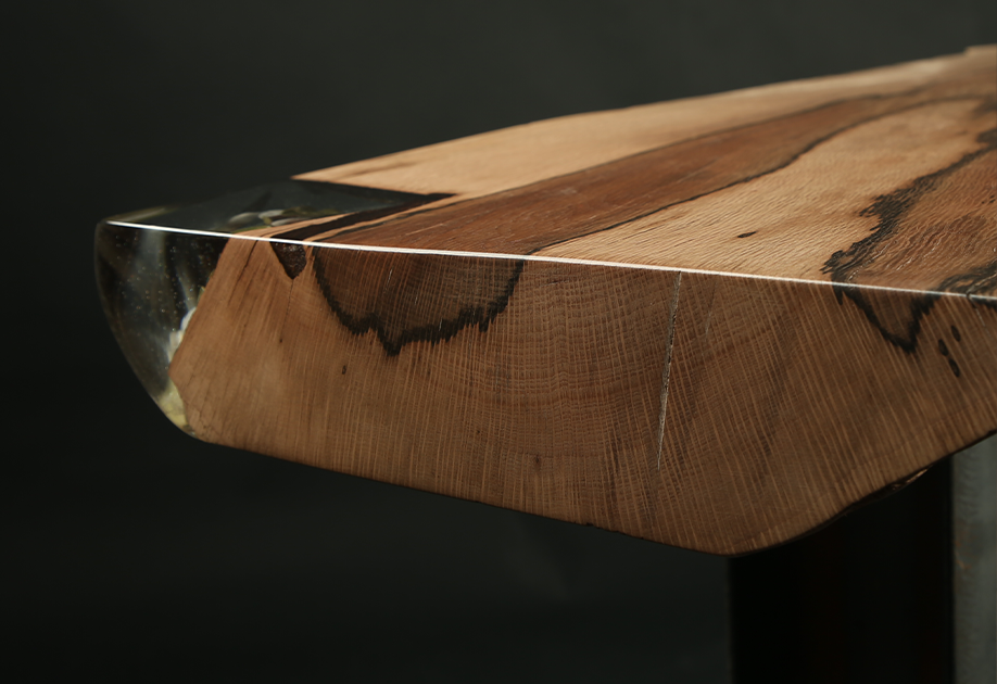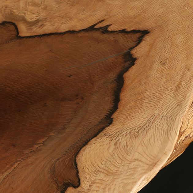 Al contrario que ocurre con el resto de árboles, la madera de cada encina es de un color. El peculiar veteado de esta pieza evoca al corte de una loncha de jamón ibérico.